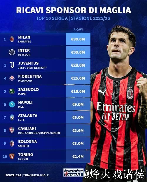 意大利当地时间近日,有关欧洲豪门俱乐部球衣赞助费用的一组数据在业内流出,引发了广泛关注。其中,AC米兰与主赞助商之间的合约金额仅约为每年2.5亿元人民币左右,这一数字不仅远低于英超劲旅曼城和曼联的赞助